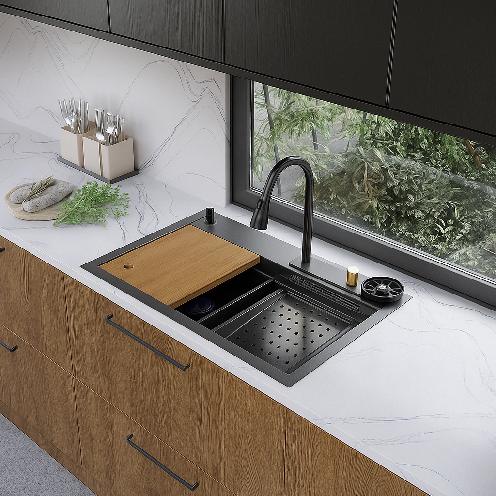 -Drenaje Rápido: Gracias a la pendiente acentuada, el agua y los residuos se evacuan rápidamente, evitando la acumulación y el estancamiento en el fregadero. Esto mejora la limpieza general y previene problemas relacionados con el drenaje lento
